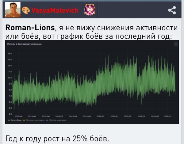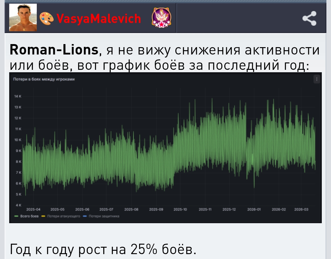 VasyaMalevich, ты нам эту лажу не впаривай тупой график если ты сам не играешь как игрок и не общаешься с игроками . ты как открыл полеты всех топы и не топы повырезали основные флота игрокам . бои конечно есть народ по ишкам летает крохи собирает . это тоже бой происходит . ты их тож в график ставишь?