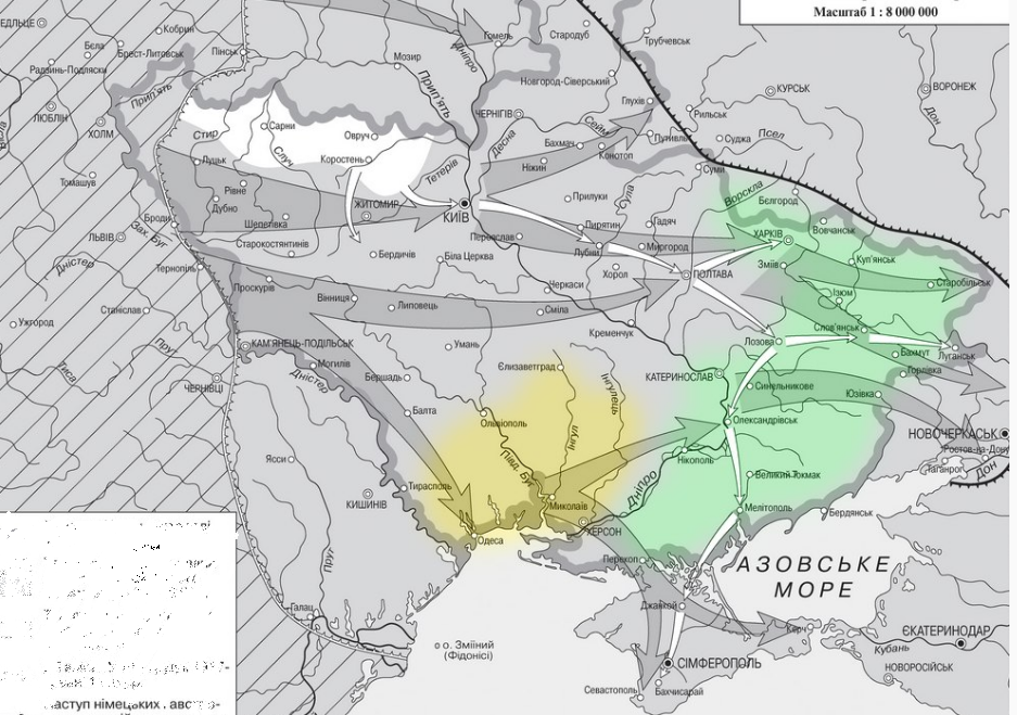 После поражения в 1 мировой Немцы да были, по договору в 1917 году была создана Украинская Народная Республика и много земли тогда было потерянно, создана она была Лениным при Поддержки немцев, и я не отрицаю что они там были.
