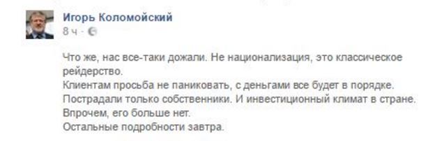 Хотя возможна и договоренность: в Привате находиться большое число активов ваших граждан около 50 процентов населения пользуется этим банком. Так вот если его признают банкротом
