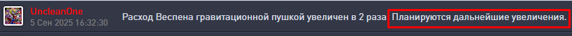 Расход Веспена гравитационной пушкой увеличен в 2 раза. Планируются дальнейшие увеличения.