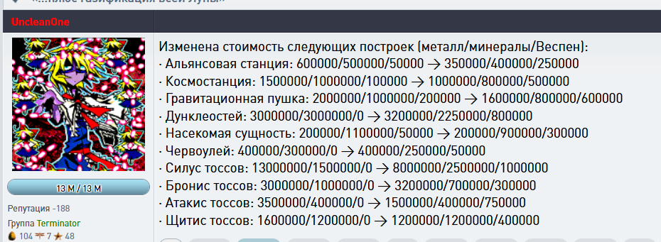 · Космостанция: 1500000/1000000/100000 → 1000000/800000/500000