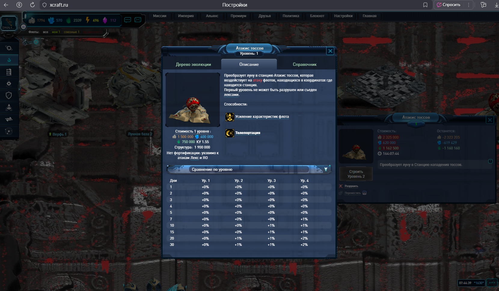 ещё раз, для тех кто в танке. Космостанции и сушки нету. Совсем. Но есть атакис, у тосов отвечает за телепортацию. Смотри первую картинку - свойства усиление флота и телепортация. Однако даже кнопки телепортация (где у космы телепорт, у сушки перемещение), такой кнопки нет. Свободные поля есть, ОПС заколонил после пирата, Лунную Базу построил, свободные поля есть.