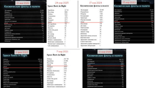 Мы, конечно, очень постарались с туманом и всем таким, но в вашей статистике не учтён один момент: в 2025-ом мы уменьшили время разгона и особенно — с планет. Это значит, что флоты при полётах на небольшие дистанции проводят в космосе меньше времени, так что при том же количестве отправок за сутки они меньше «перекрываются», и в «мгновенном» срезе, на который вы смотрите, числа будут меньше.