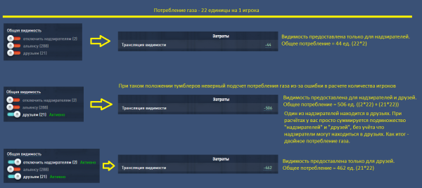 В дополнение к скрину: исключение надзирателя из списка друзей снижает потребление газа на 22 ед. (общее потребление становится 484 ед. вместо 506 ед.), при этом видимость не пропадает.