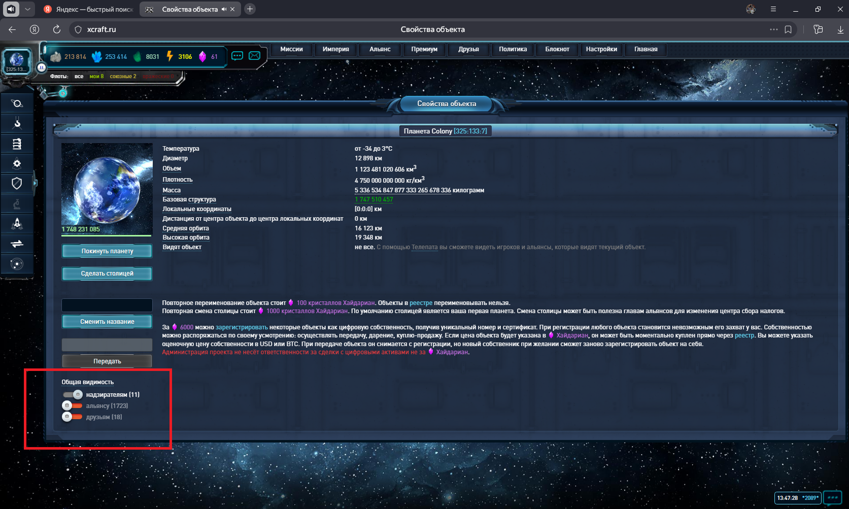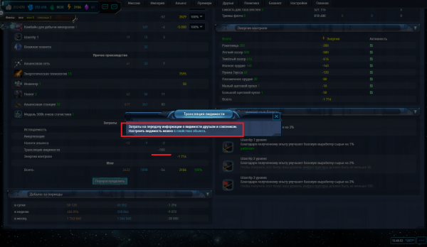 Проверял вкладку сырьё на всех планетах, на одной планете идёт расход газа на трансляцию видимости хотя для всех отключена.