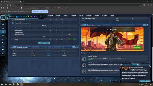Описание:после выхода с игры останавливается добыча ресурсов и энергия уходит в минус . Что видно на первом скрине , после входа в раздел сырьё всё восстанавливается .что видно на втором скрине . Это длится больше месяца