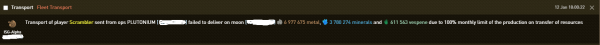 Resources sent long distance by ally failed to deliver to my OPS with reason "due to 100% monthly limit of the production on transfer of resources" but the limit was not breached or even close to the threshold shown on the market page