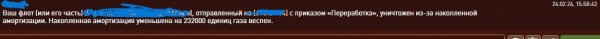 Анонс такого встречали вообще или что-нибудь о таком слышали? ... "Ваш флот (или его часть) (*), отправленный на (*) с приказом «Переработка», уничтожен из-за накопленной амортизации. Накопленная амортизация уменьшена на (*) единиц газа веспен."