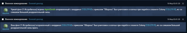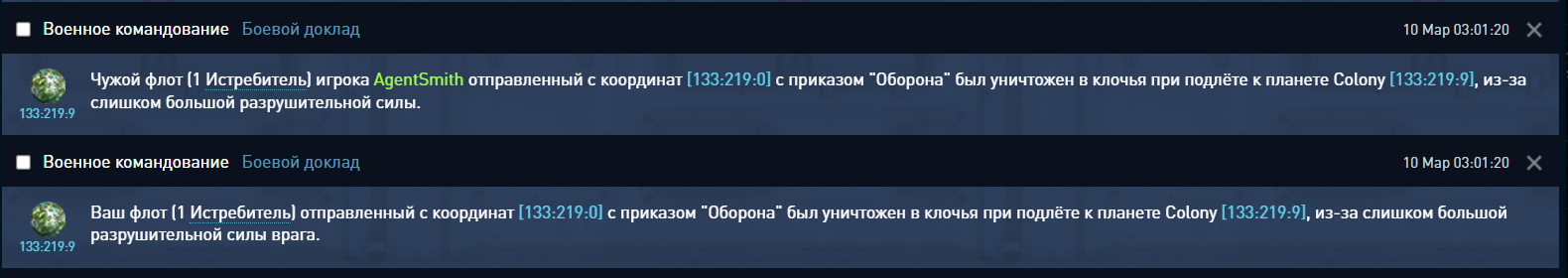 Описание: Своя колония подвергалась пожиранию Лексом, в этот момент на эту колонию на низкую орбиту прилетел свой же истребитель с приказом "оборона". В результате, истребитель уничтожен в клочья на подлете и пришло два отчета: в одном говорится "ваш флот 1 истребитель уничтожен", а в другом "чужой флот 1 истребитель уничтожен". P S AgentSmith мой второй аккаунт, я описываю, что на нем происходило. Если что, наградить прошу Wesker