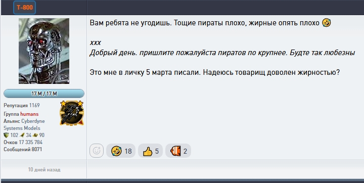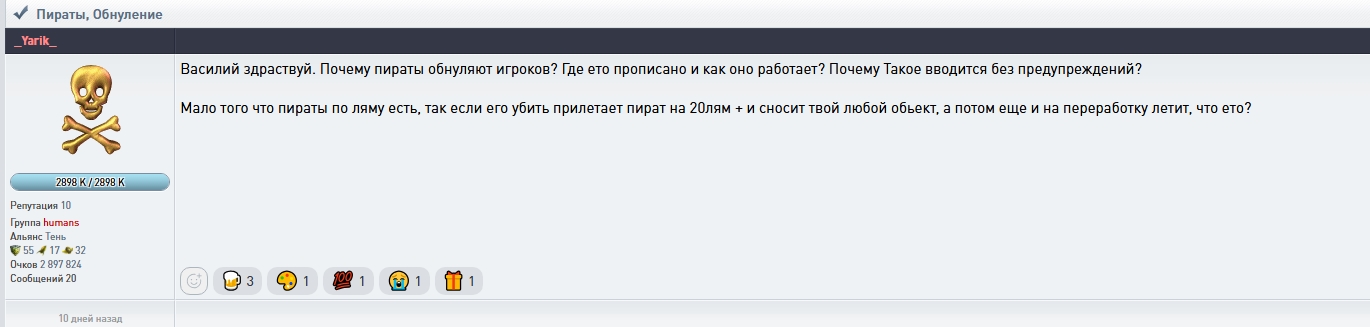 Совсем не понятно про что речь, если им не понравились пираты которых они сами и наслали на всех то надо просто откатить аки на число до атаки пиров и все, а не списывать ресы. Откуда мне теперь все возить на зануленные планки и опски? Я вот например совсем не уверен что с этих пиров я получил больше чем потерял. Почему все делается через з...цу? Сначала всех напрягли, потом все отняли епрст.